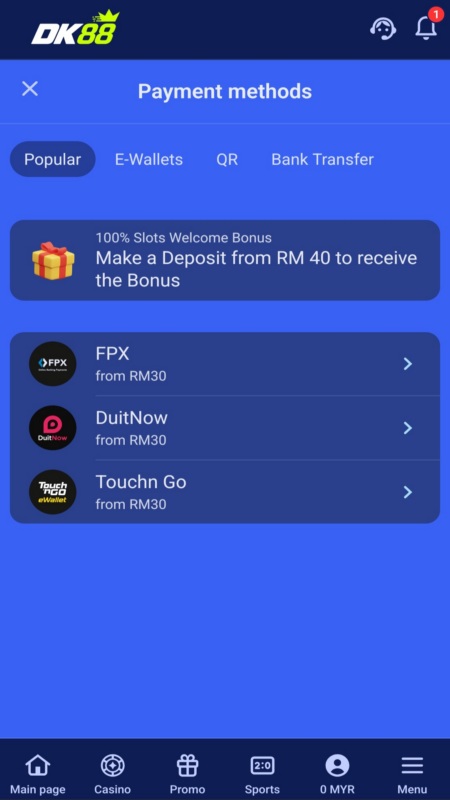 There are a range of deposit and withdrawal methods DashKing88 bettors in Malaysia can use to fund their betting accounts. For withdrawals, only methods you’ve used to make a deposit will be listed in the Withdrawals section.